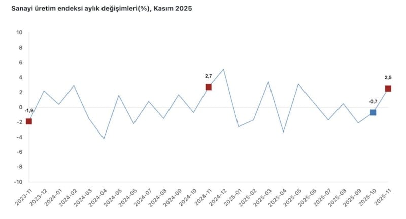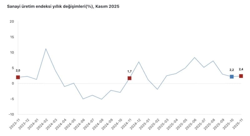 Türkiye İstatistik Kurumu'nun verilerine göre, kasım ayında sanayi üretimi yıllık bazda yüzde 2,4 arttı. Madencilik endeksi hafifçe artarken, imalat sektörü önemli bir artış gösterdi. Elektrik ve gaz sektöründe ise bir azalma meydana geldi.