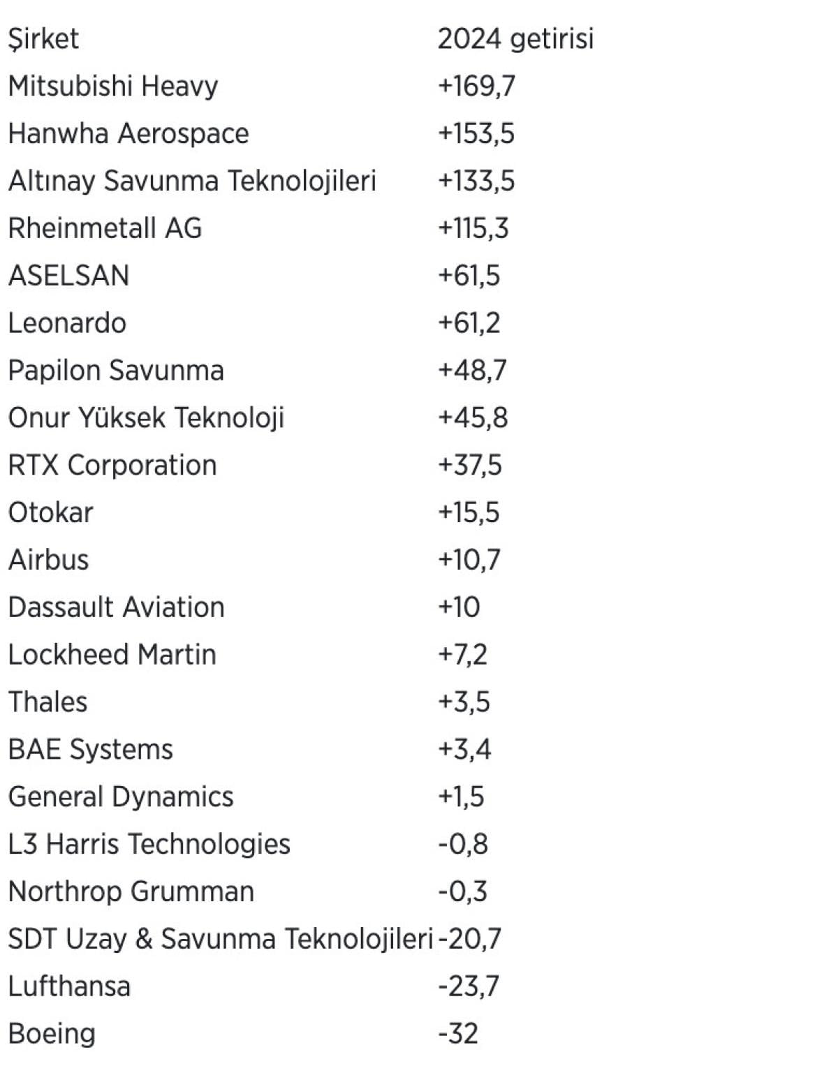 Dünyanın önde gelen savunma ve havacılık şirketleri ile Borsa İstanbul'da işlem gören savunma sanayi şirketlerinin hisselerinin 2024 yılındaki getirileri (yüzde) şöyle: