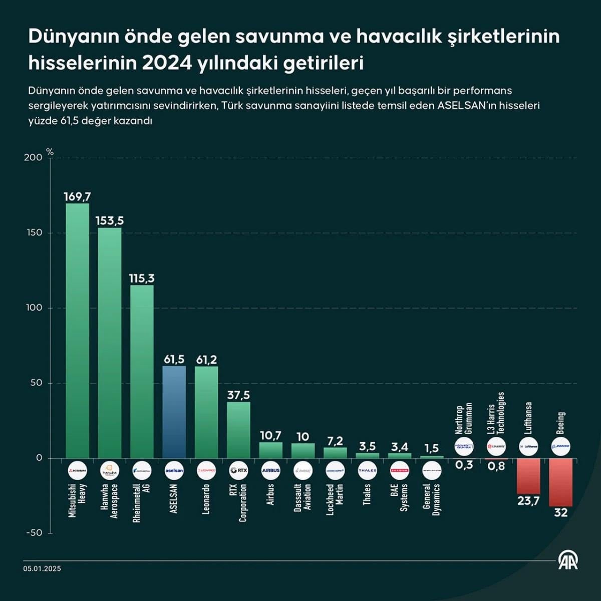 Dünyanın önde gelen savunma ve havacılık şirketlerinin hisselerinin 2024 yılındaki getirileri belli olurken Borsa İstanbul'da enleri açıklandı.