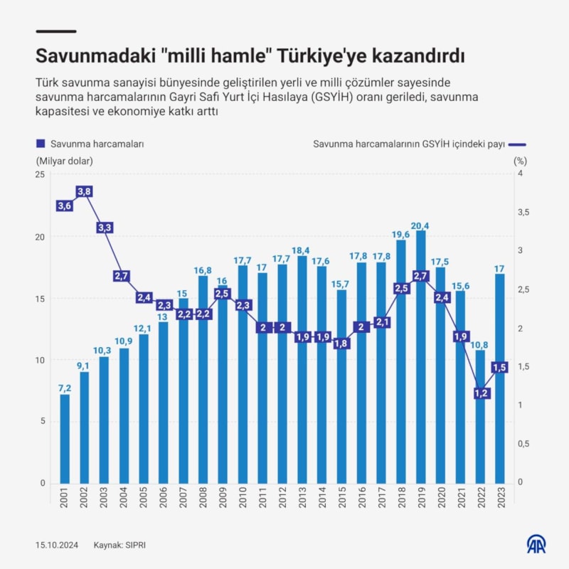 2002 yılında yüzde 3,8'e kadar çıkan bu oran yerli üretim kapasitesinin artması sayesinde izleyen yıllarda düşmeye başladı. 2023 yılına gelindiğinde Türkiye’nin savunma harcamaları 17 milyar dolara yükselmesine rağmen, bu harcamaların GSYİH'ya oranı yüzde 1,5'e kadar geriledi.