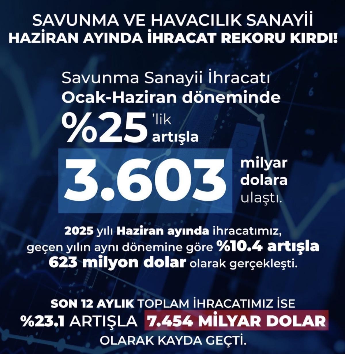 Haluk Görgün, konuya ilişkin X sosyal medya platformundan yaptığı paylaşımda, ocak-haziran döneminde savunma ve havacılık ihracatının yüzde 25 artışla 3 milyar 603 milyon dolara ulaştığını belirtti.