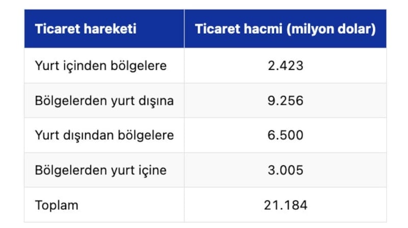 Yurt dışından bölgelere gerçekleştirilen ticaret ise 6 milyar 500 milyon dolar olarak kayıtlara geçti.