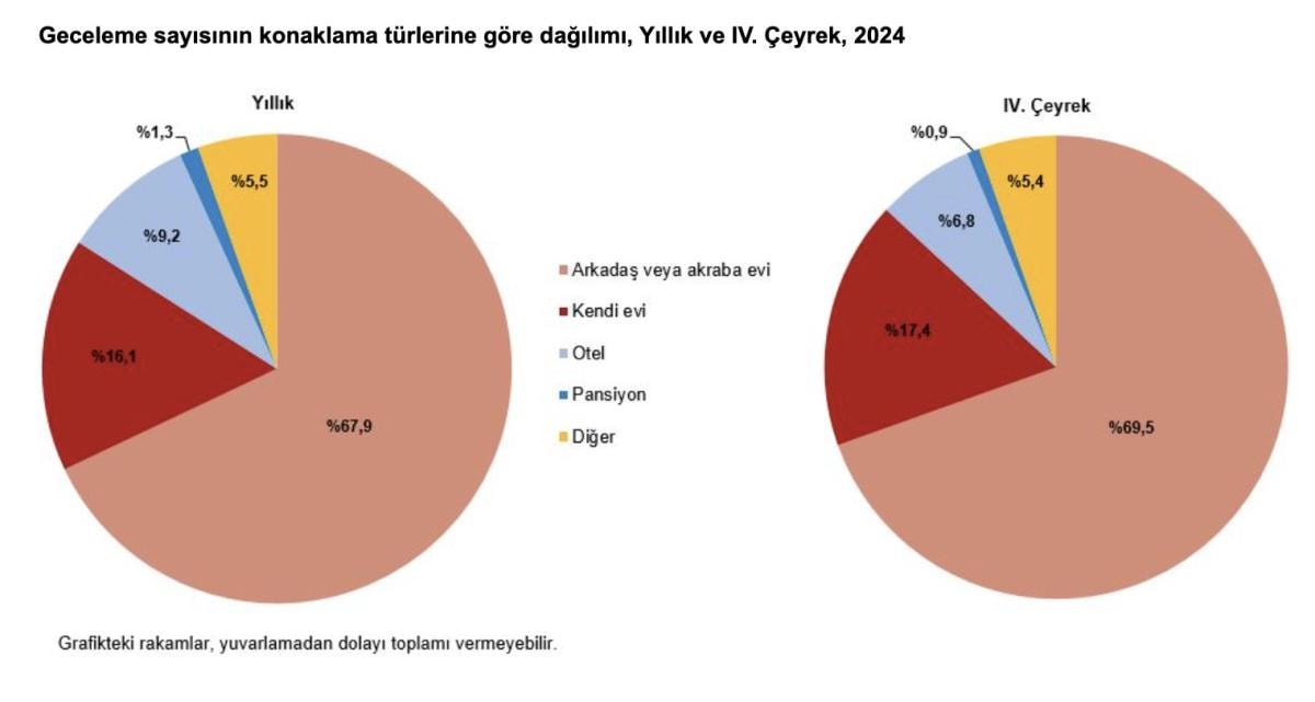 Bu çeyrekte, seyahate çıkanlar 53 milyon 250 bin geceleme sayısı ile en çok "arkadaş veya akraba evinde" kaldı.