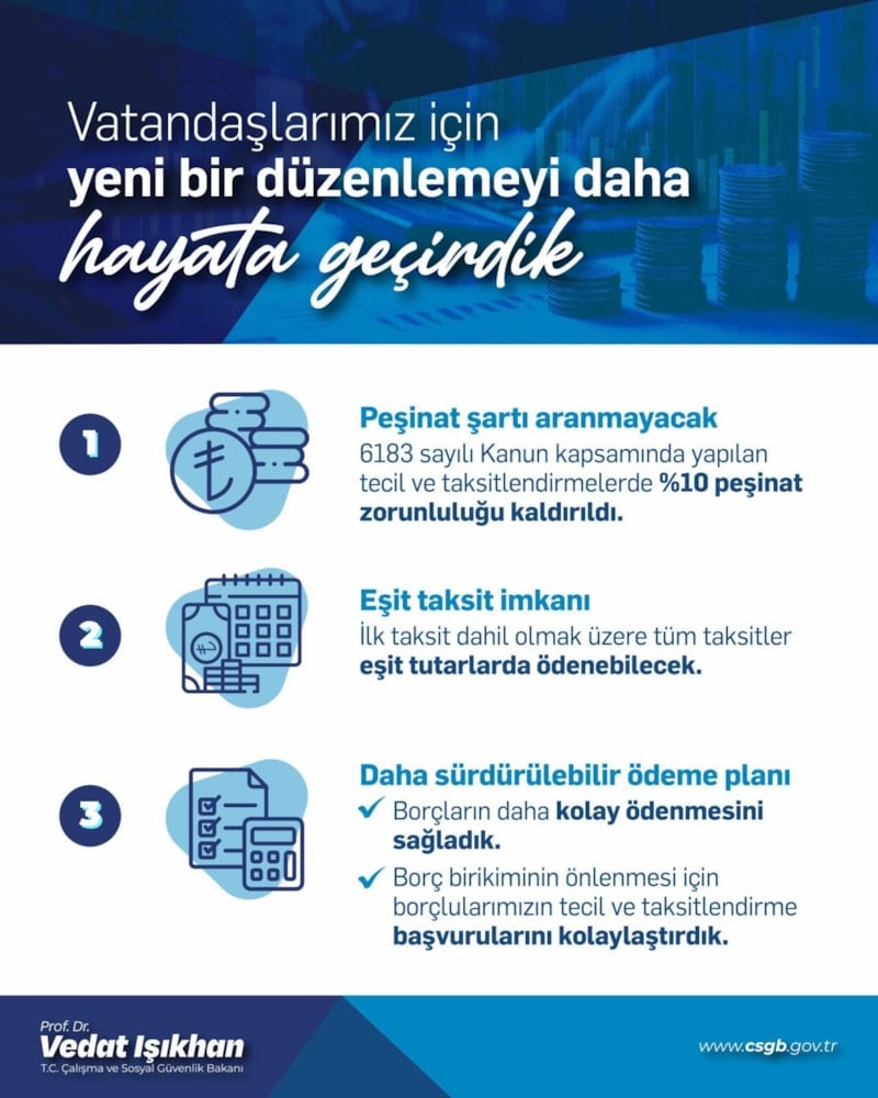 Çalışma ve Sosyal Güvenlik Bakanı Vedat Işıkhan'ın sosyal medya hesabından yaptığı aktarıma göre, yapılan düzenlemeyle, tecil ve taksitlendirme başvurularında aranan yüzde 10 peşinat zorunluluğu kaldırıldı.