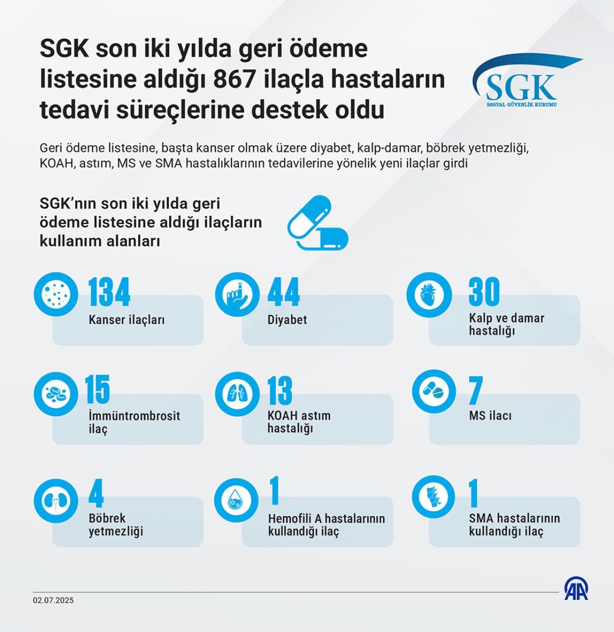 Sosyal Güvenlik Kurumu (SGK), son 2 yılda geri ödeme listesine dahil ettiği toplam 867 yeni ilaçla, başta kanser ve diyabet hastalıklarının tedavi süreçlerine destek sağladı.