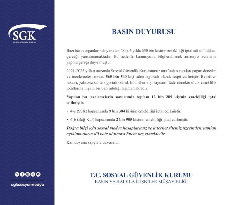 "Bazı basın organlarında yer alan 'Son 5 yılda 650 bin kişinin emekliliği iptal edildi' iddiası gerçeği yansıtmamaktadır. Bu nedenle kamuoyunu bilgilendirmek amacıyla açıklama yapma gereği duyulmuştur.