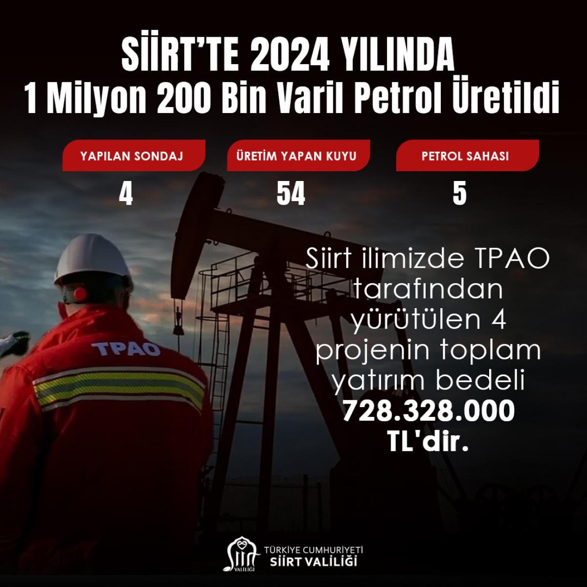 Yayınlanan mesaja göre Siirt'te 2024 yılı içinde 4 sondaj yapıldı, 54 üretim yapan kuyu ve 5 petrol sahası faaliyette.