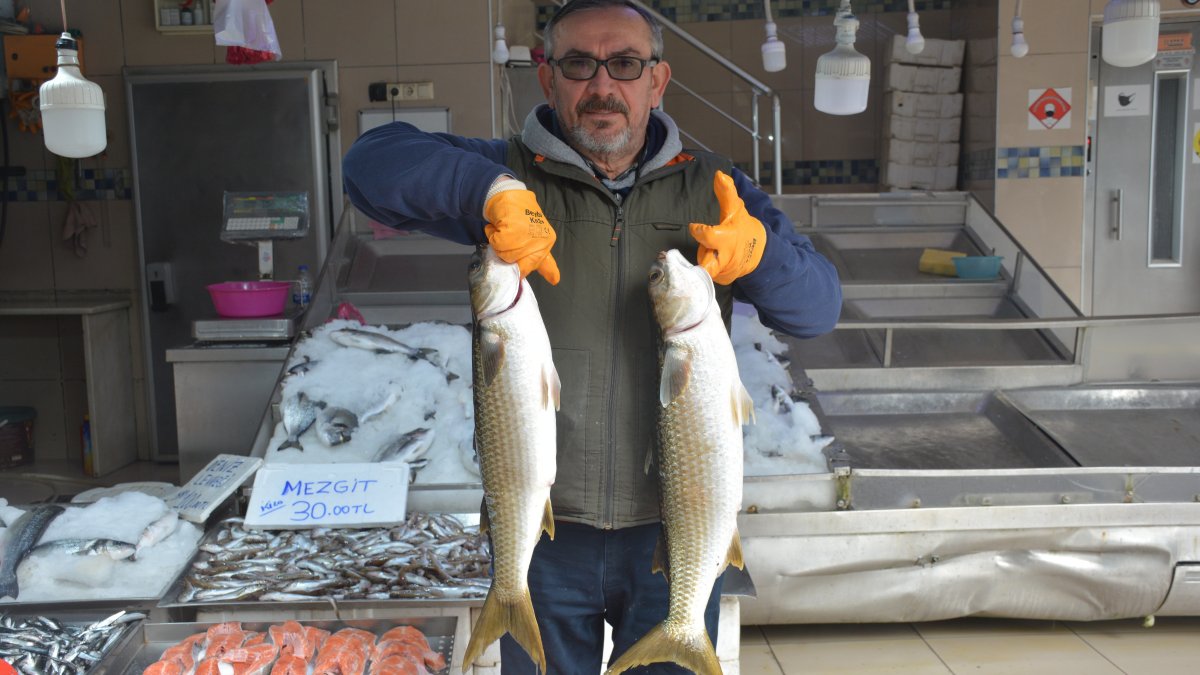 Balıkçı İbrahim Gündoğdu, "Bu kefal balığının büyüğü, buna 'tokmak kafa’ derler. Çok lezzetli bir balıktır. İki balık toplam 6 kilogram ağırlığında.