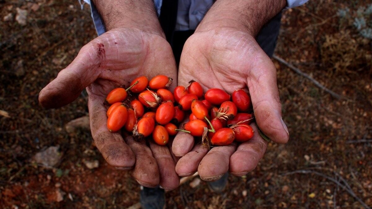 Kuşburnu çalılar ve dikenler arasında toplanıyor