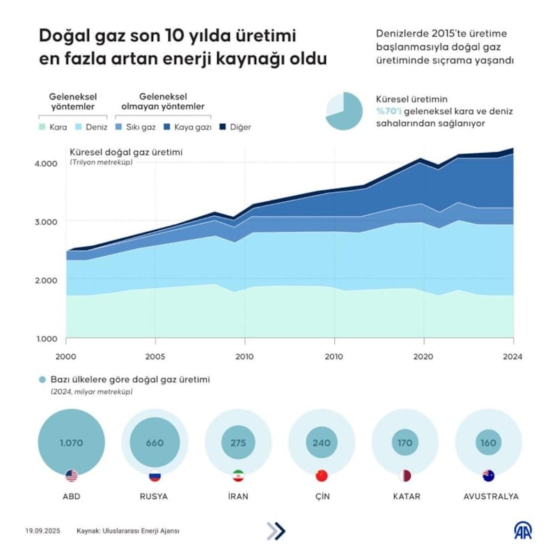 Geleneksel kara doğalgaz üretimi, 2000'den bu yana yaklaşık 1 trilyon 800 milyar metreküp seviyesinde istikrarlı seyir gösterdi. Buna karşılık, geleneksel deniz doğalgaz üretimi düzenli olarak arttı. 2015'ten bu yana her yıl ortalama 30 milyar metreküp artarak 2024'te yaklaşık 1 trilyon 300 milyar metreküp seviyesine ulaştı. Bu artış büyük ölçüde Orta Doğu'da, özellikle İran ve Suudi Arabistan'daki gelişmelerin yanı sıra Avustralya'daki üretimle yaşandı.