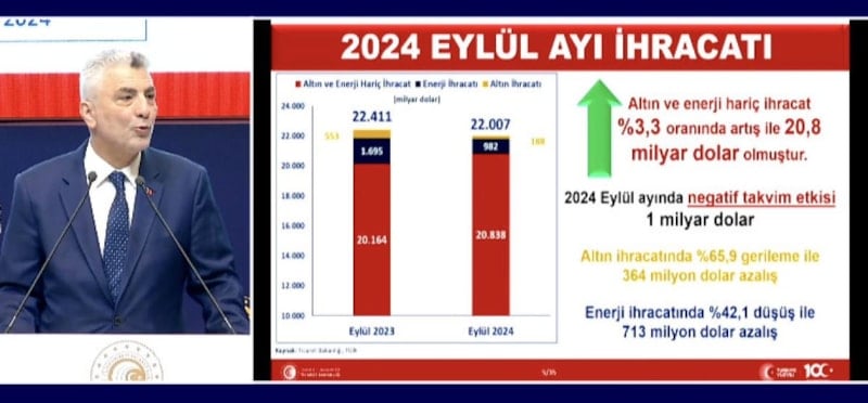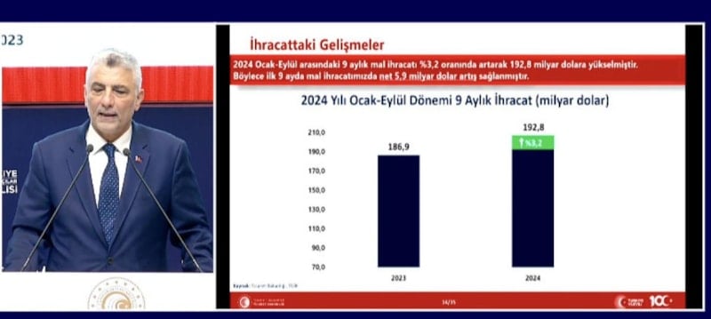 Ticaret Bakanı Ömer Bolat, 2024 yılı Eylül ayı ve üçüncü çeyrek dış ticaret rakamlarını açıkladı. Bolat, takvim etkisinden dolayı ihracatın 22 milyar 7 milyon dolar olduğunu belirtti. Türkiye'nin ihracatı 9 ayda ise 193 milyar dolar oldu.