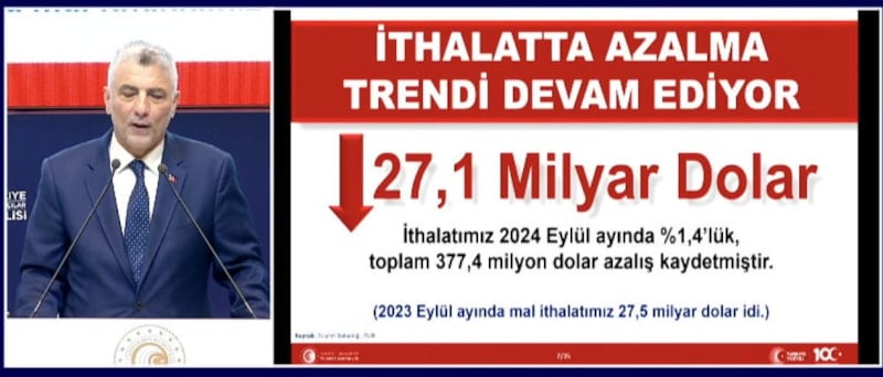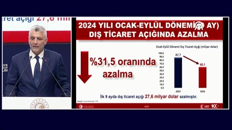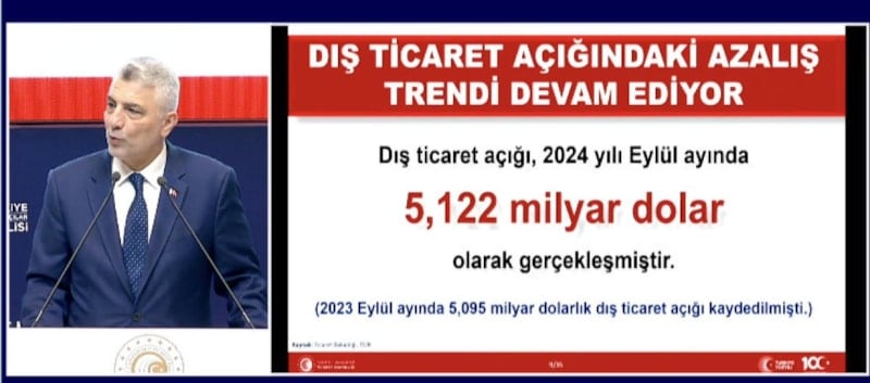 2024 yılı eylül ayı itibari ile, son 12 ayda yıllıklandırılmış dış ticaret açığı 35 milyar dolar azalarak, 78,7 milyar dolara geriledi.