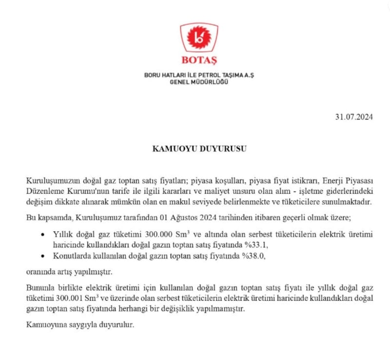Son dakika haberine göre; Boru Hatları ile Petrol Taşıma AŞ (BOTAŞ) tarafından, konutlarda kullanılan doğalgaza zam geldiği duyuruldu.
