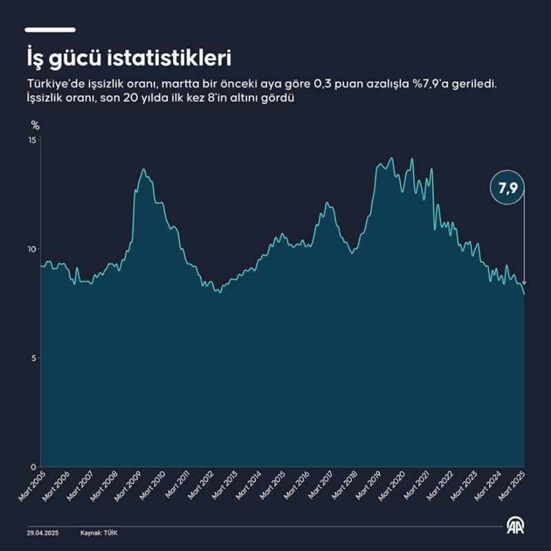 TÜİK, işsizlik ve istihdamdaki mart ayı verilerini gözler önüne serdi. İşsizlik oranı son 20 yılda ilk kez 8'in altını gördü.