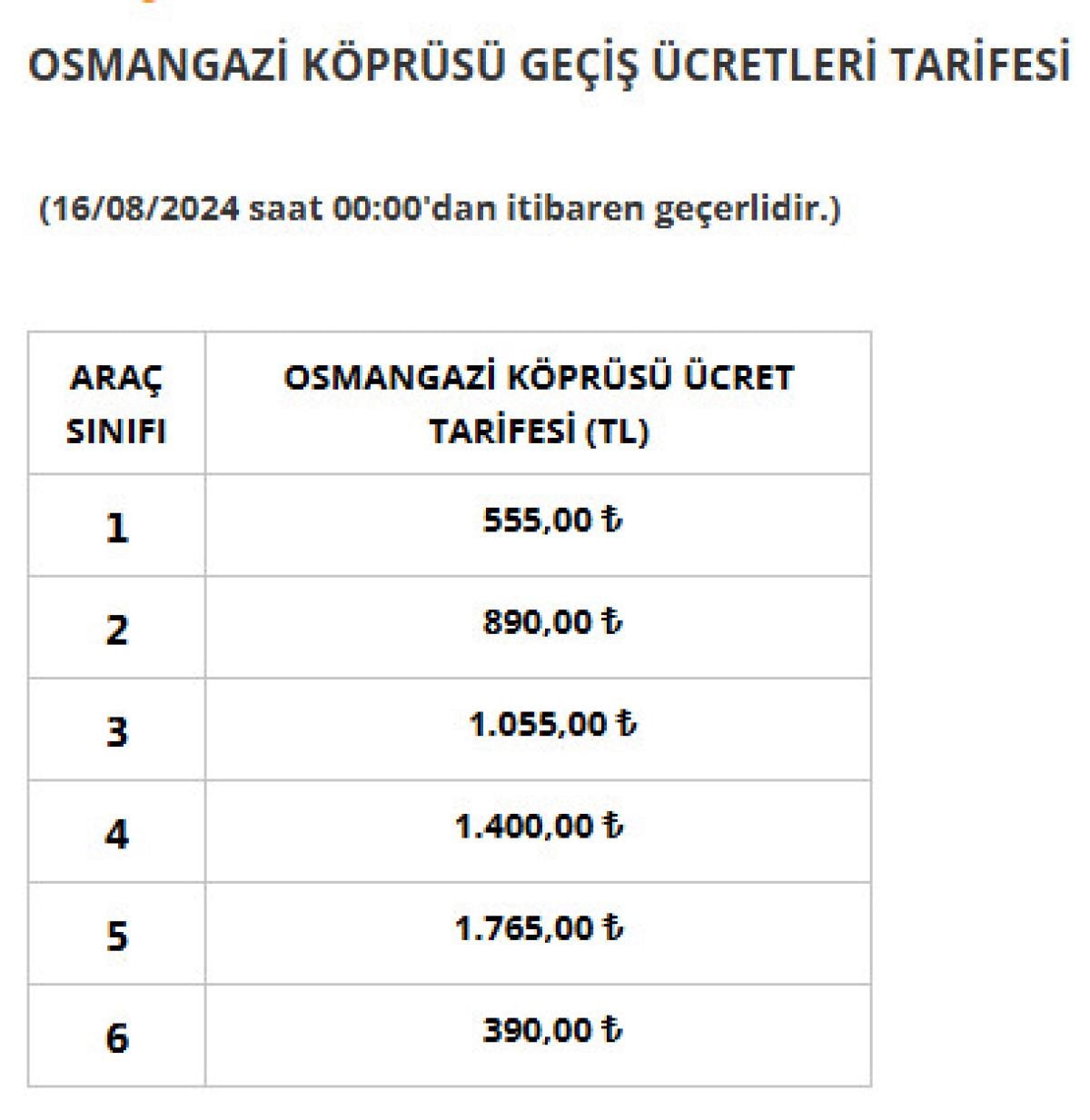 Yavuz Sultan Selim Köprüsü’nden geçiş ücreti 49 TL’den 70 TL’ye, Osmangazi Köprüsü’nden geçiş ücreti 399TL’den 555 TL’ye çıktı.