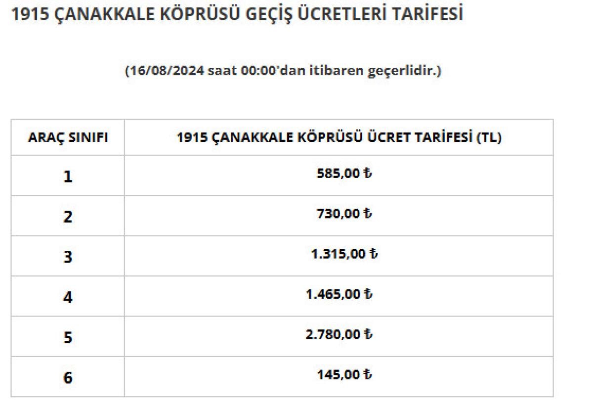 1915 Çanakkale Köprüsü'nden geçiş ise otomobil için 419 liradan 585 liraya yükseldi.