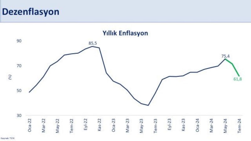 Yıllık enflasyon düşüyor. Temmuzda aylık enflasyon geçici etkiler kaynaklı arttı. Yıllık enflasyon ise hazirana göre 9,8 puan azalarak yüzde 61,8'e geriledi.