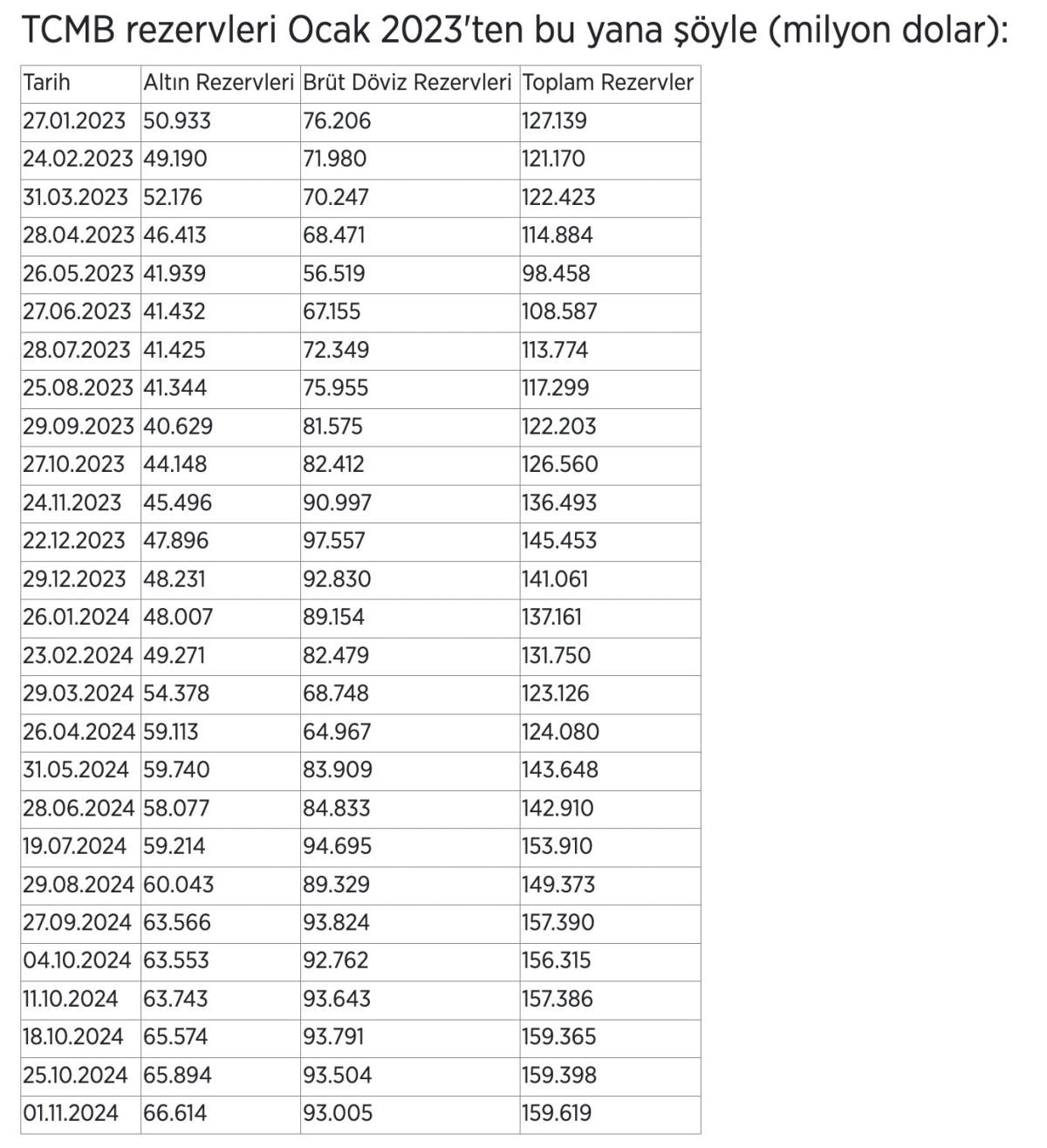 Buna göre, 1 Kasım itibarıyla Merkez Bankası brüt döviz rezervleri 499 milyon dolar azalışla 93 milyar 5 milyon dolara indi.