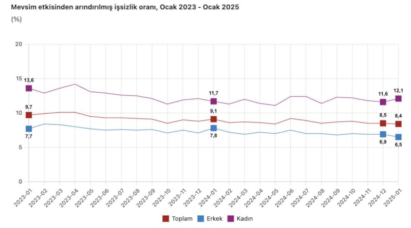 TÜİK verilerine göre mevsim etkisinden arındırılmış işsizlik oranı yüzde 8,4 seviyesinde gerçekleşti.