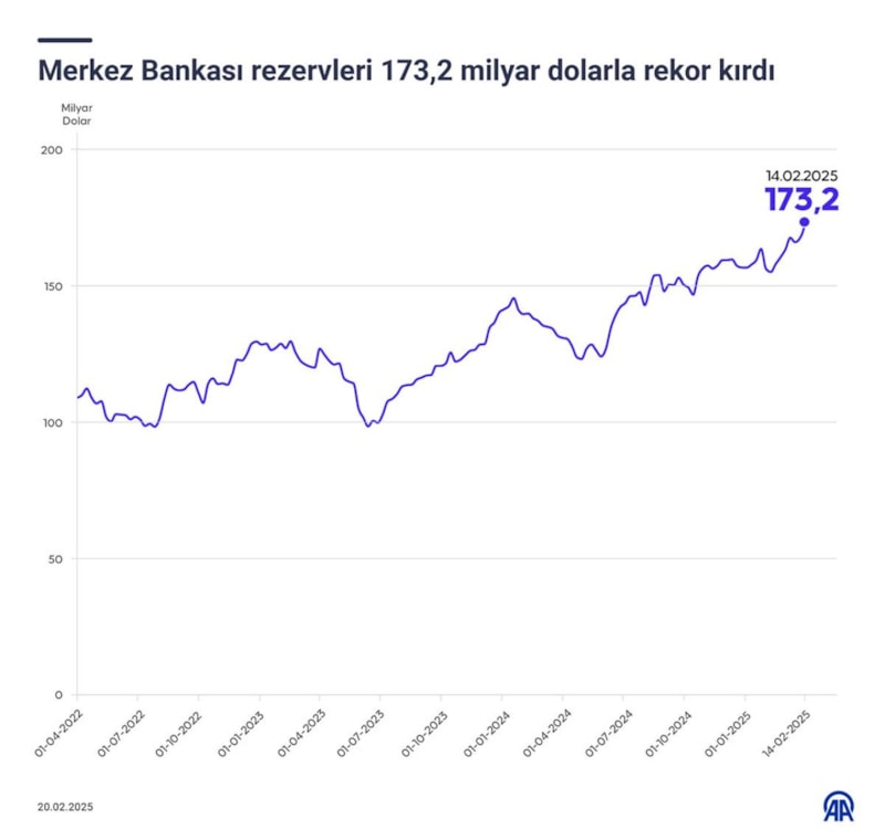 Merkez Bankası; toplam rezervleri, 14 Şubat haftasında bugüne kadar tespit edilen en yüksek seviye olan 173,2 milyar dolara çıktı.