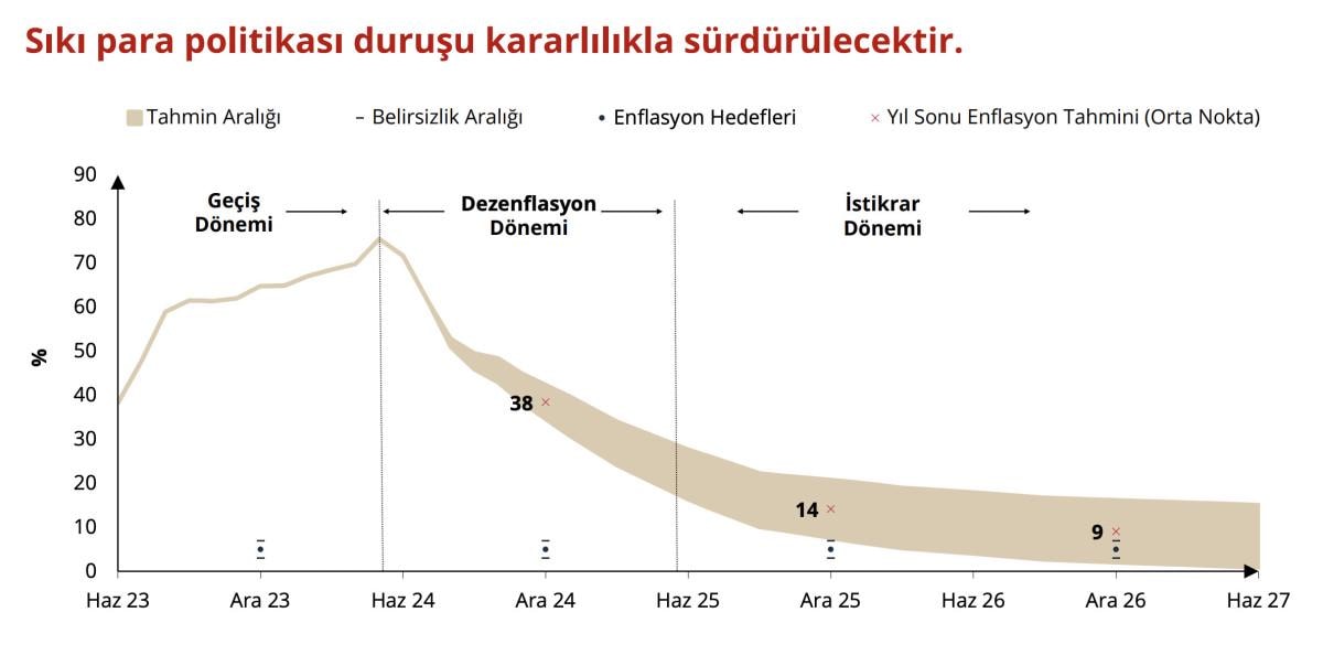 -Haziranda başlayan dezenflasyon sürecinde, enflasyonu, belirlediğimiz ara hedeflerle uyumlu olacak şekilde düşürmek için ne gerekiyorsa yapmaya devam edeceğiz.