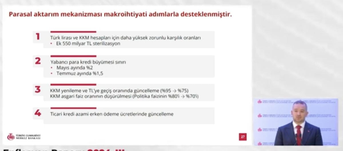 TCMB Başkanı Fatih Karahan, yılın üçüncü Enflasyon Raporu'nu tanıtımı amacıyla Merkez Bankası İdare Merkezi'nde bilgilendirme düzenlenen toplantıda tahmin aralığının korunduğunu belirterek şu açıklamada bulundu:
