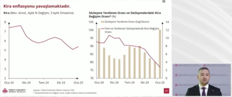 Kira enflasyonunun yüksek olmakla beraber yavaşlama eğiliminde olduğunu görüyoruz. Ocak ayında aylık kira enflasyonundaki dönemsel artış, kira sözleşme yenileme oranındaki yükselişten kaynaklanıyor.