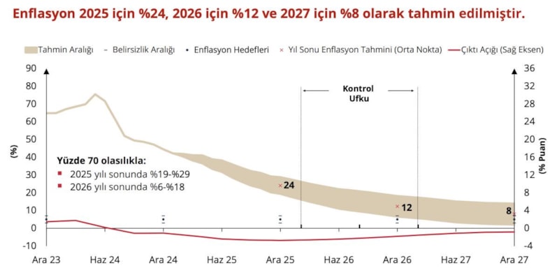 Son enflasyon raporunda TCMB, 2024 yılının 4. Enflasyon Raporu toplantısında 2025 yıl sonu enflasyon tahminlerini sırasıyla yüzde 21 olarak yukarı yönlü güncellemiş, 2026'da ise yüzde 12'ye gerileyeceğini öngörmüştü.