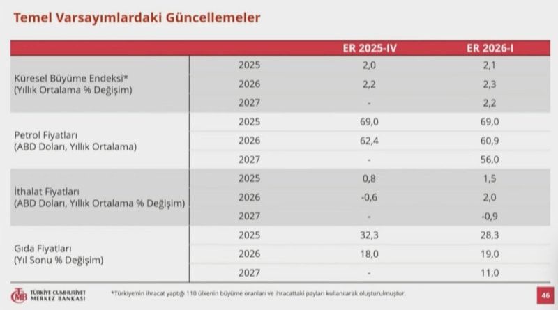 Temel varsayımlardaki beklentiler yukarı yönlü güncellendi. Petrol fiyatları, ithalat fiyatları ve gıda fiyatlarına ilişkin varsayımlar yükseltildi.