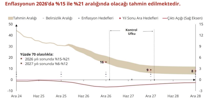 2026 yılında enflasyonun, yüzde 15 ile yüzde 21 aralığında olacağını tahmin ediyoruz. 2027 sonu için ise tahminlerimiz, enflasyonun yüzde 6 ile yüzde 12 aralığına gerileyeceğine işaret ediyor.