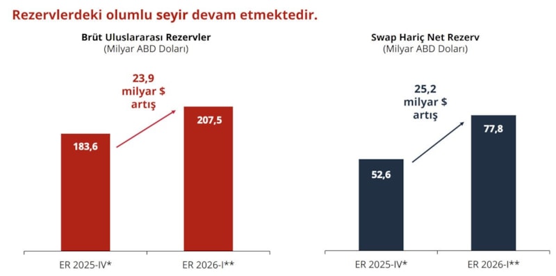 KKM, 0,1 milyar doların altına geriledi. Sermaye görünümü güç kazandı. Rezervlerdeki olumlu seyir devam etmektedir. Altın fiyatlarındaki yükseliş 22 milyar dolar katkı sağladı.