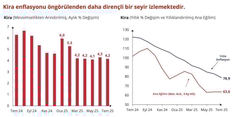 Kira enflasyonu öngörülenden daha dirençli bir seyir izlemektedir. Konut değerleme raporları üzerinden takip edilen veriler bu aşağı yönle eğilimi teyit ediyor. Kira enflasyonu öngörülenden daha dirençli bir seyir izliyor. Kira dışında kalan hizmetlerde, yıllık enflasyon aşağı yönlü belirgin ayrışırken ana eğilim de kademeli bir yavaşlama eğilimi içerisinde.