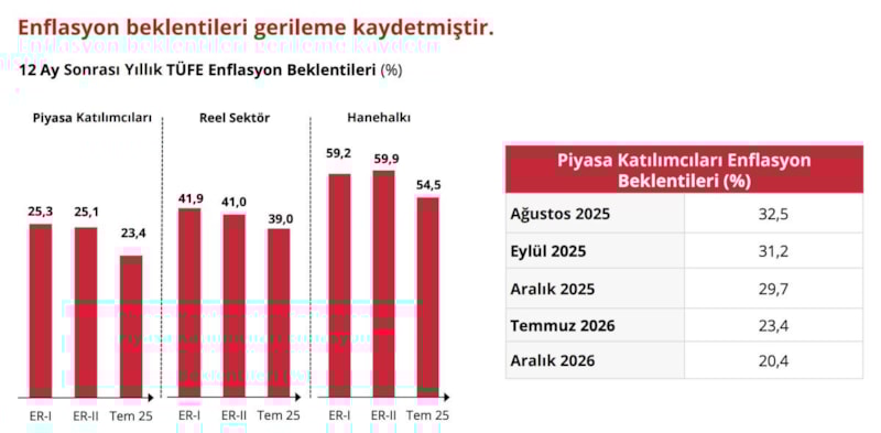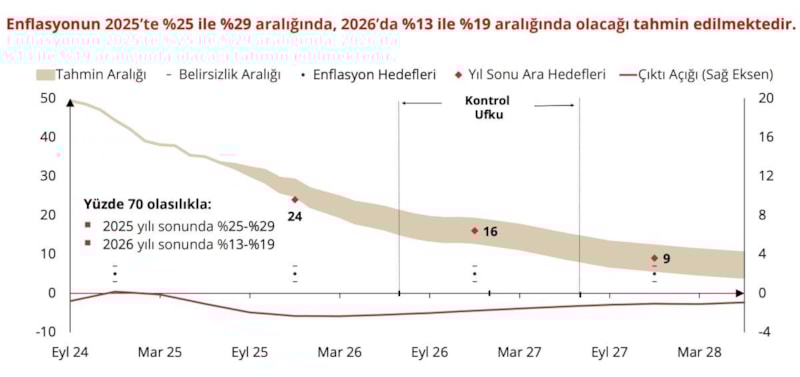 2025 yıl sonunda enflasyonun yüzde 25 ile yüzde 29 aralığında olacağını tahmin ediyoruz. 2026 sonu için ise tahminlerimiz, enflasyonun yüzde 13 ile yüzde 19 aralığına gerileyeceğine işaret ediyor.