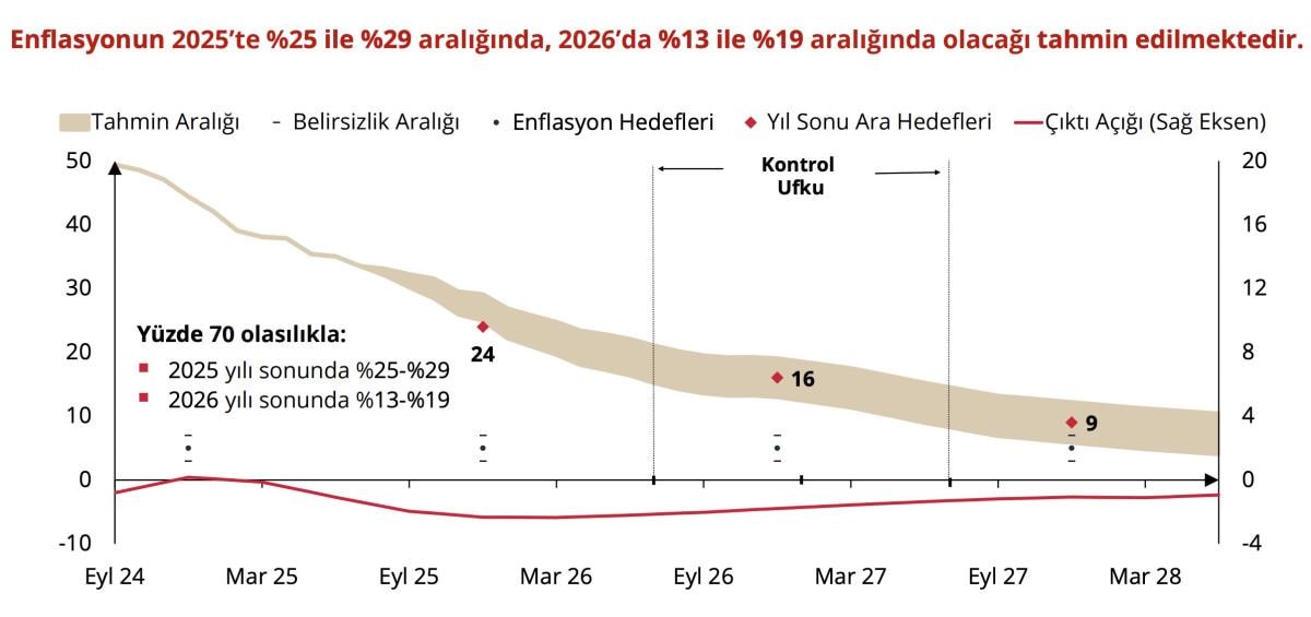 "2025 yıl sonu enflasyon tahminimiz olan yüzde 24 değerini, 2025 yılı ara hedefimiz olarak koruyoruz." diyen TCMB Başkanı Karahan, "Enflasyonun 2025 sonunda yüzde 25 ile yüzde 29 aralığında olacağını, 2026 sonu için de yüzde 13 ile yüzde 19 aralığına gerileyeceğini tahmin ediyoruz. 2026 ve 2027 yılları için ise enflasyon ara hedeflerimizi sırasıyla yüzde 16 ve yüzde 9 olarak belirledik. Enflasyon tahminlerimizin yanı sıra rapor dönemleri arasında olağanüstü gelişmeler olmadığı sürece değiştirmeyeceğimiz ara hedeflerimizle karşınıza çıkacağız." dedi.