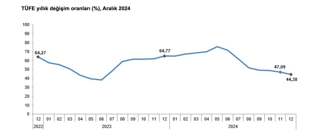 TÜFE'deki değişim 2024 yılı Aralık ayında bir önceki aya göre yüzde 1,03, bir önceki yılın Aralık ayına göre yüzde 44,38, bir önceki yılın aynı ayına göre yüzde 44,38 ve on iki aylık ortalamalara göre yüzde 58,51 olarak gerçekleşti.