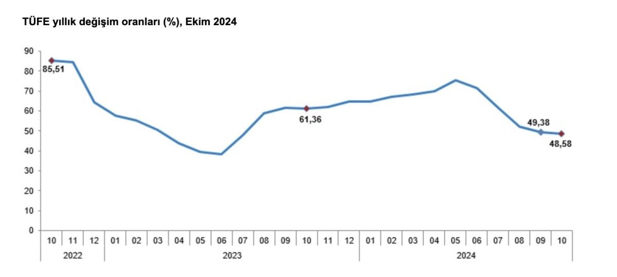 TÜFE'deki değişim 2024 yılı Ekim ayında; bir önceki aya göre yüzde 2,88, bir önceki yılın Aralık ayına göre yüzde 39,77, bir önceki yılın aynı ayına göre yüzde 48,58 ve on iki aylık ortalamalara göre yüzde 62,02 olarak gerçekleşti.