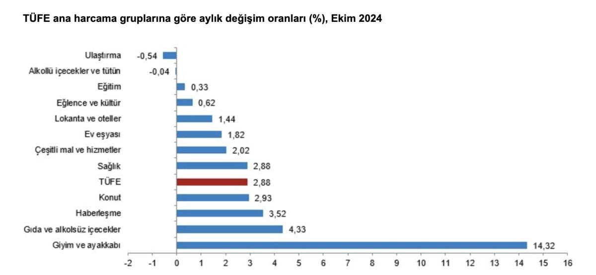 Ana harcama grupları itibarıyla 2024 yılı Ekim ayında bir önceki aya göre en çok azalan ana grup, yüzde -0,54 ile ulaştırma oldu. Buna karşılık, 2024 yılı Ekim ayında bir önceki aya göre artışın en yüksek olduğu ana grup ise yüzde 14,32 ile giyim ve ayakkabı oldu (ana harcama gruplarına göre endeksler, ağırlıklar ve değişim oranları Ek Tablo-1'dedir).