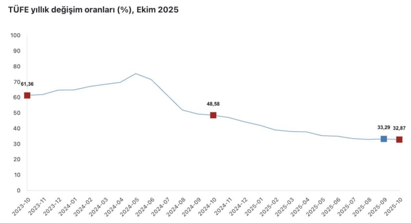 TÜFE'deki değişim 2025 yılı Ekim ayında; bir önceki aya göre yüzde 2,55 artış, bir önceki yılın Aralık ayına göre yüzde 28,63 artış, bir önceki yılın aynı ayına göre yüzde 32,87 artış ve on iki aylık ortalamalara göre yüzde 37,15 artış olarak gerçekleşti.