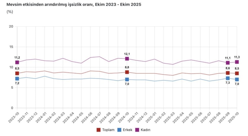 TÜİK verilerine göre, mevsim etkisinden arındırılmış işsizlik oranı, 2025 yılı Ekim ayında bir önceki aya göre 27 bin kişi azalarak yüzde 8,5 seviyesinde gerçekleşti.