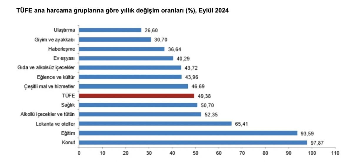 TÜFE'deki değişim 2024 yılı Eylül ayında; bir önceki aya göre 2,97, bir önceki yılın Aralık ayına göre 35,86, bir önceki yılın aynı ayına göre 49,38 ve on iki aylık ortalamalara göre 63,47 olarak gerçekleşti.