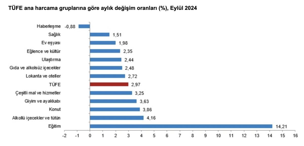 Ana harcama grupları itibarıyla 2024 yılı Eylül ayında bir önceki aya göre azalan ana grup yüzde-0,88 ile haberleşme oldu. Buna karşılık, 2024 yılı Eylül ayında bir önceki aya göre artışın en yüksek olduğu ana grup ise yüzde 14,21 ile eğitim oldu.