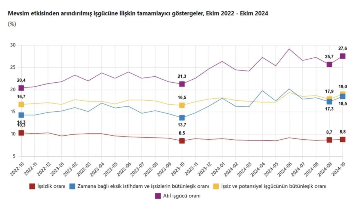 Zamana bağlı eksik istihdam, potansiyel işgücü ve işsizlerden oluşan atıl işgücü oranı 2024 yılı Ekim ayında, bir önceki aya göre 1,9 puan artarak yüzde 27,6 oldu.