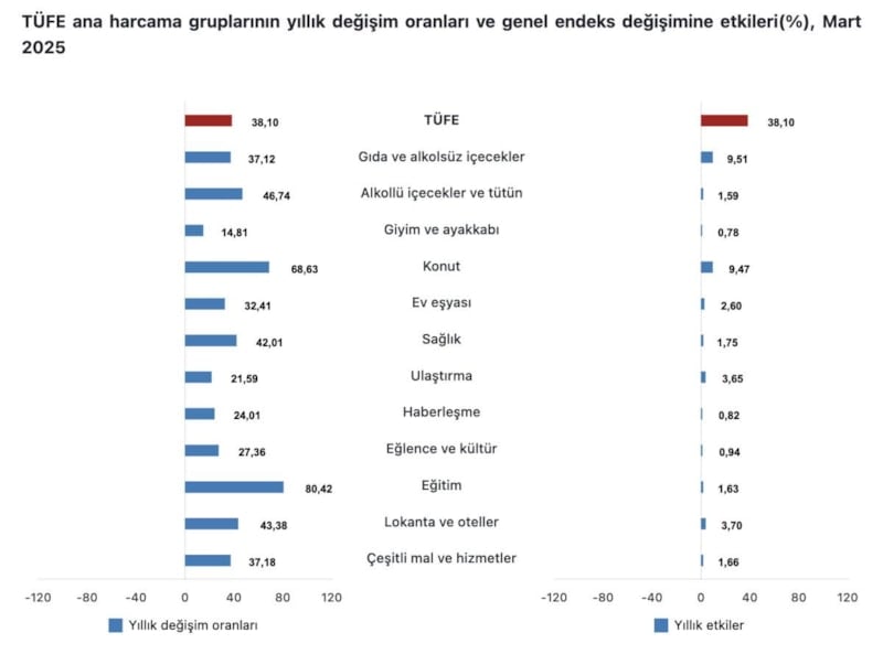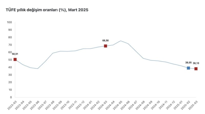 TÜFE'deki değişim 2025 yılı Mart ayında bir önceki aya göre yüzde 2,46 artış, bir önceki yılın Aralık ayına göre yüzde 10,06 artış, bir önceki yılın aynı ayına göre yüzde 38,10 artış ve on iki aylık ortalamalara göre yüzde 51,26 artış olarak gerçekleşti.