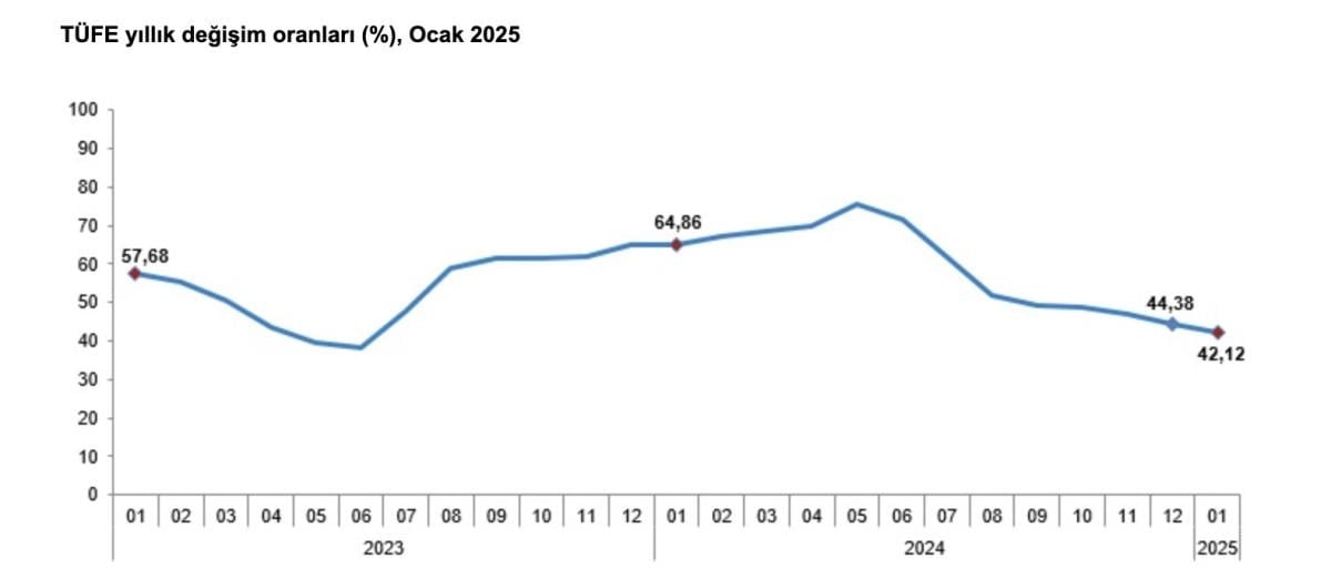 TÜFE'deki değişim 2025 yılı Ocak ayında; bir önceki aya göre yüzde 5,03, bir önceki yılın Aralık ayına göre yüzde 5,03, bir önceki yılın aynı ayına göre yüzde 42,12 ve on iki aylık ortalamalara göre yüzde 56,35 olarak gerçekleşti.