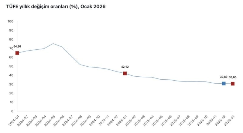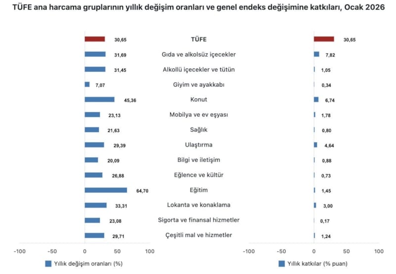 TÜFE'deki değişim 2026 yılı Ocak ayında, bir önceki aya göre yüzde 4,84 artış, bir önceki yılın aralık ayına göre yüzde 4,84 artış, bir önceki yılın aynı ayına göre yüzde 30,65 artış ve on iki aylık ortalamalara göre yüzde 33,98 artış olarak gerçekleşti.