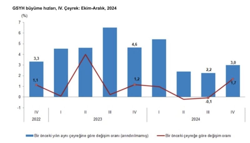 Ekim-Aralık 2024 dönemi ve 2024'ün tamamına ait büyüme verileri belli oldu. GSYH 2024 yılı dördüncü çeyreğinde yüzde 3, 2024 yılının tamamında ise yüzde 3,2 arttı.