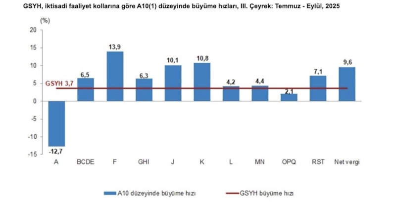 GSYH'yi oluşturan faaliyetler incelendiğinde; 2025 yılı üçüncü çeyreğinde bir önceki yıla göre zincirlenmiş hacim endeksi olarak; inşaat yüzde 13,9, finans ve sigorta faaliyetleri yüzde 10,8, bilgi ve iletişim faaliyetleri yüzde 10,1, ürün üzerindeki vergiler eksi sübvansiyonlar yüzde 9,6, diğer hizmet faaliyetleri yüzde 7,1, sanayi sektörü yüzde 6,5, ticaret, ulaştırma, konaklama ve yiyecek hizmetleri yüzde 6,3, mesleki, idari ve destek hizmet faaliyetleri yüzde 4,4, gayrimenkul faaliyetleri yüzde 4,2, kamu yönetimi, eğitim, insan sağlığı ve sosyal hizmet faaliyetleri yüzde 2,1 arttı. Tarım sektörü ise yüzde 12,7 azaldı.