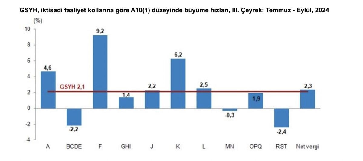 GSYH'yi oluşturan faaliyetler incelendiğinde; 2024 yılı üçüncü çeyreğinde bir önceki yıla göre zincirlenmiş hacim endeksi olarak; inşaat yüzde 9,2, finans ve sigorta faaliyetleri yüzde 6,2, tarım sektörü yüzde 4,6, gayrimenkul faaliyetleri yüzde 2,5, ürün üzerindeki vergiler eksi sübvansiyonlar yüzde 2,3, bilgi ve iletişim faaliyetleri yüzde 2,2, kamu yönetimi, eğitim, insan sağlığı ve sosyal hizmet faaliyetleri yüzde 1,9 ve hizmetler yüzde 1,4 arttı. Diğer hizmet faaliyetleri yüzde 2,4, sanayi sektörü yüzde 2,2, mesleki, idari ve destek hizmet faaliyetleri ise yüzde 0,3 azaldı.