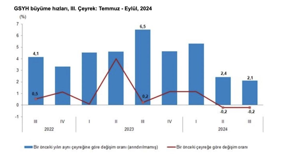 Gayrisafi Yurt İçi Hasıla (GSYH) 2024 yılı üçüncü çeyrek ilk tahmini; zincirlenmiş hacim endeksi olarak, bir önceki yılın aynı çeyreğine göre yıllık yüzde 2,1 arttı.