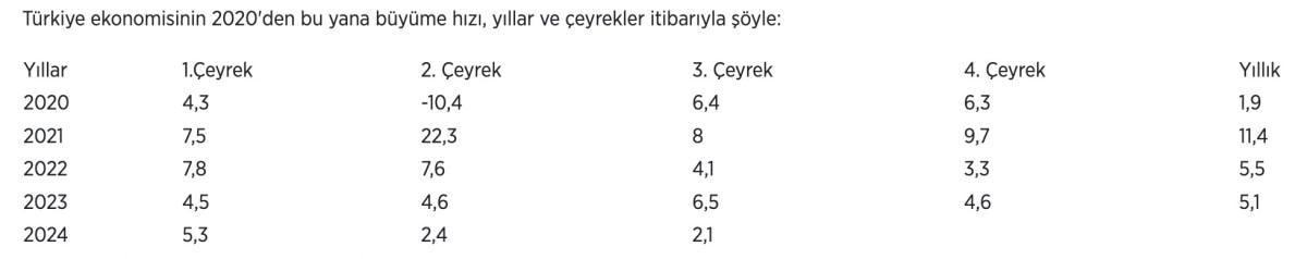 GSYH 2024 yılı birinci çeyrekte, bir önceki yılın aynı çeyreğine göre yüzde 5,7 arttı. Türkiye ekonomisi 2024'ün ikinci çeyreğinde ise yüzde 2,5 büyüdü.